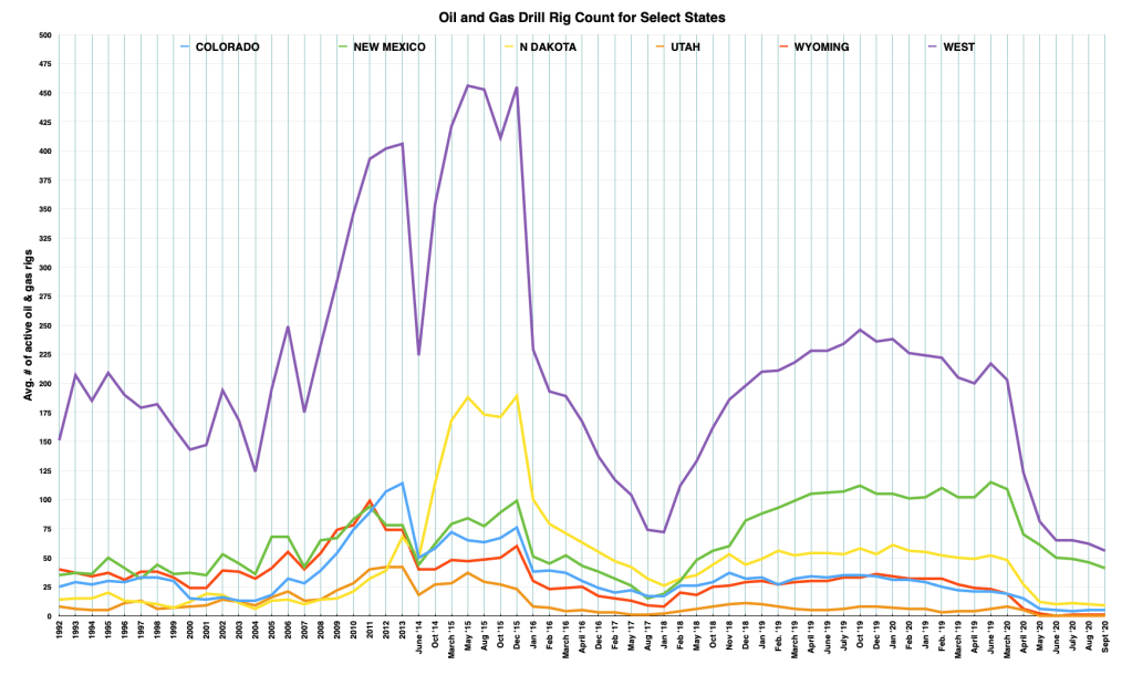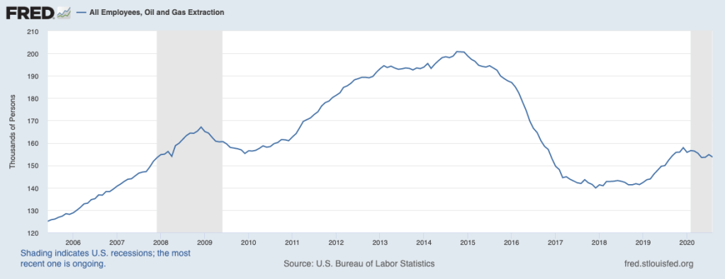 The drilling phase of oil and gas extraction is the most labor intensive (a rig can employ 50 people or more, while a producing well only provides about five jobs), so when the rig count crashes, so does employment in the oil and gas fields.