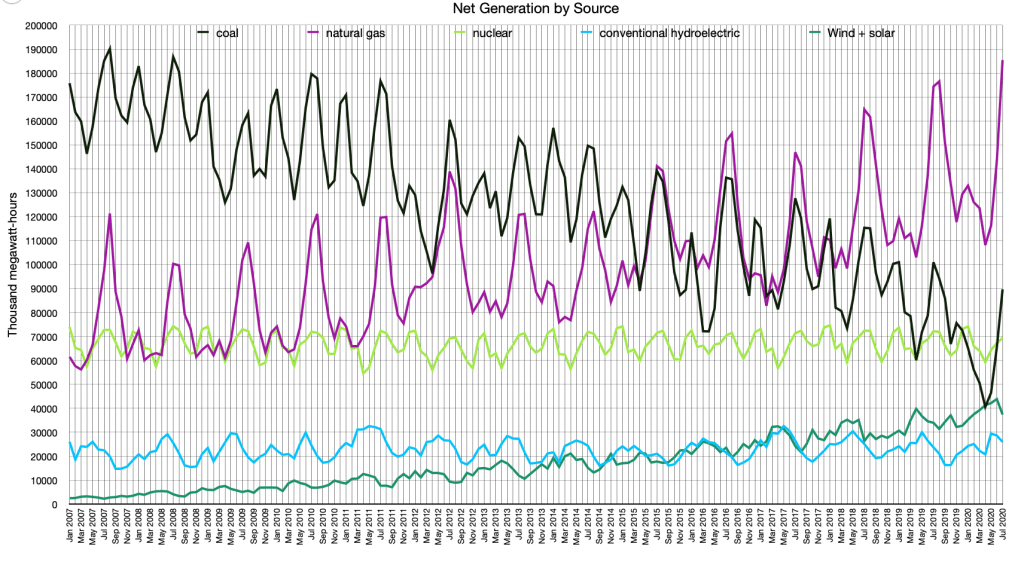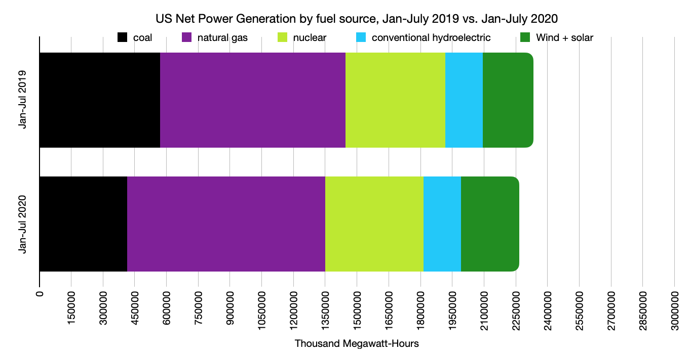 COVID-19’s impact on the electricity sector has been a little more nuanced, but significant nonetheless, particularly when it comes to coal consumption. During the first seven months of 2020, Americans used 3 percent less electricity than they did during those same seven months in 2019, in spite of the fact that many parts of the country experienced their hottest summers on record (air conditioners guzzle electricity). Most of the reduction came in April, when there was a 7 percent decrease in electricity use and a whopping 30 percent reduction in coal consumption for electricity generation.