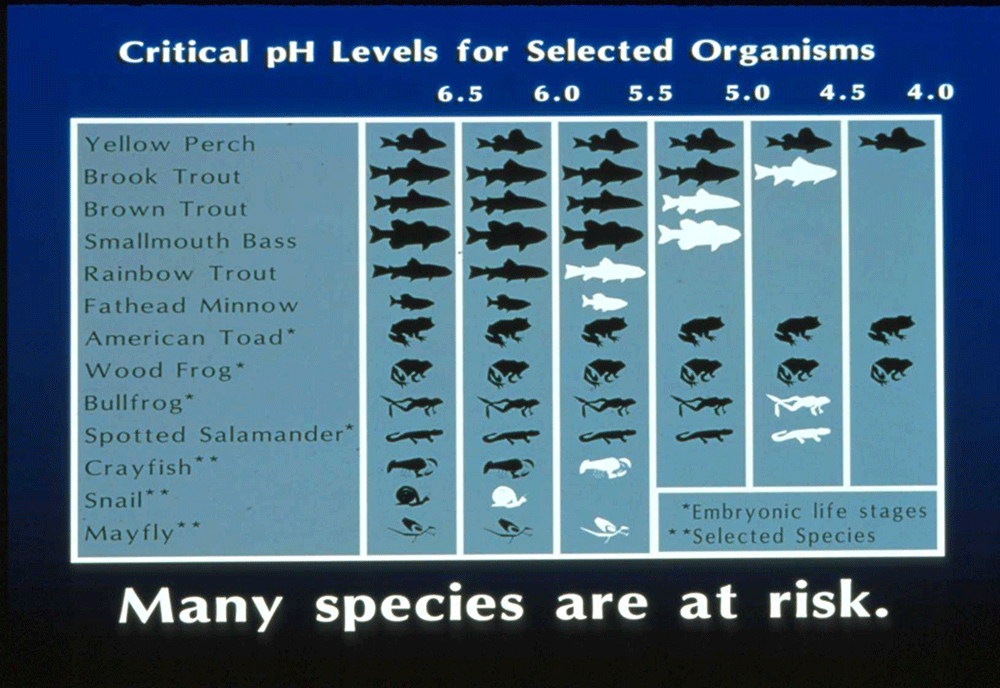 This shows the relative hardiness of various organisms when it comes to pH levels in water. Remember that the higher the pH, the lower the acidity. Ideal pH is around 6.5. Water draining from the Gold King Mine has a pH of 2.5. Cement Creek can run as low as 3.5 pH, making it virtually uninhabitable to all but extremophiles. Keep in mind that acidity is not the only harmful component of acid mine drainage; heavy metal loading is often worse.